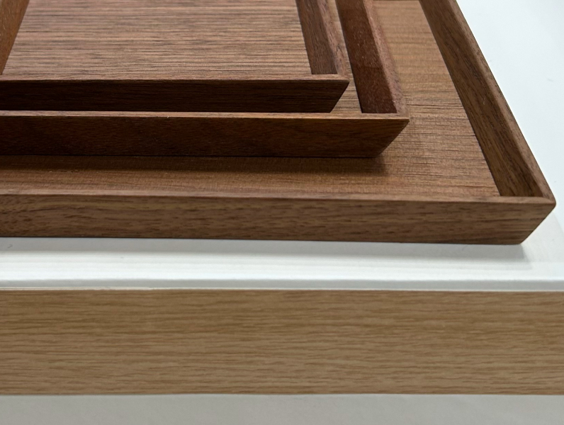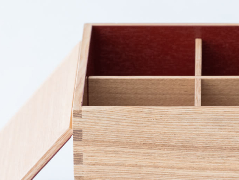 漆器ではあまり用いられないタモ材やウォールナットを使い、木目の美しさを最大限に引き出しながら、傷が目立ちにくいマットで透明な塗料で仕上げています。